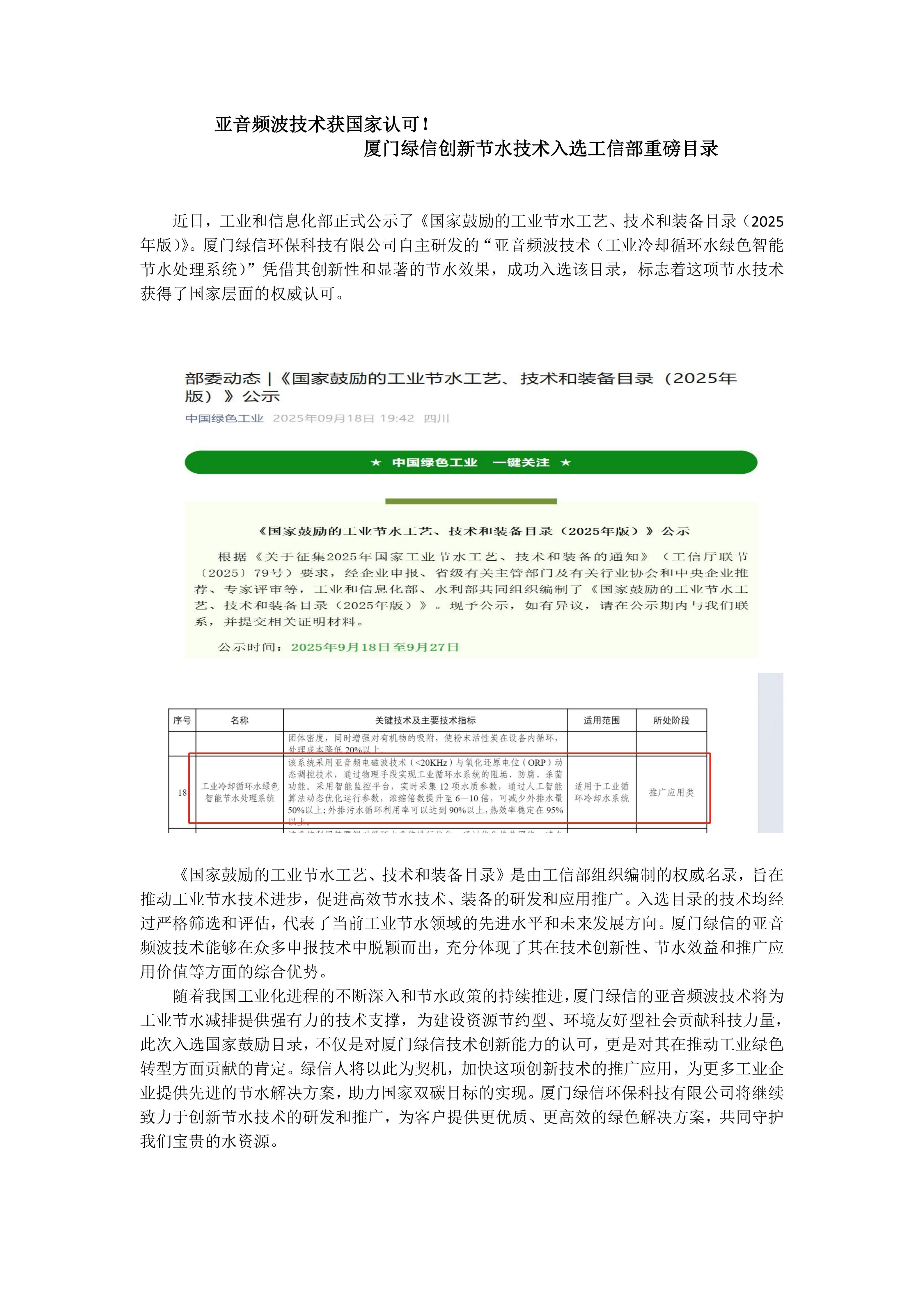 近日,工业和信息化部正式公示了《国家鼓励的工业节水工艺、技术和装备目录(2025年版)》。厦门绿信环保科技有限公司自主研发的“亚音频波技术(工业冷却循环水绿色智能节水处理系统)”凭借其创新性和显著的节水效果,成功入选该目录,标志着这项节水技术获得了国家层面的权威认可。
